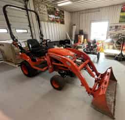 Used, 2014 Kubota BX1870 tractor, LA203 loader with 48″ pin on bucket with 2 weld hooks. 3 cylinder, 18HP, diesel engine. 2 range, hydrostatic transmission. 4WD. Rear & Mid-PTO.