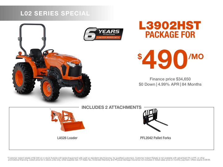 Customer instant rebate of $2,500 (applied to advertised price) on in stock Kubota L02 series Equipment with cash or standard rate financing, for qualified customers. Customer Instant Rebate is not available with advertised 0% A.P.R. or other promotional financing. Listed price for in-stock units only, while supplies last. CT Sales Tax, Extended Warranty and Physical Damage Insurance not included in listed sales price or monthly payment. Offers expire 2/28/26.